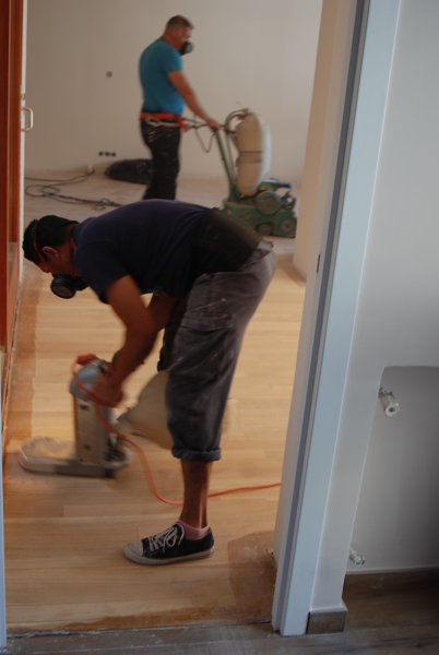 El precio de acuchillado y barniz al agua,sobre los 17-23€ m2.