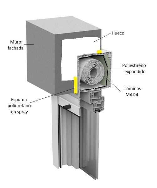 El exterior del cajón queda tapado por la fachada y se rellenó por fuera con espuma de poliuretano un espacio que había entre cajón y fachada y el ruido disminuyó mucho pero después de 2 meses se escucha todo de nuevo.