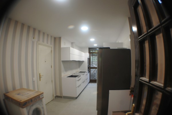 En una obra reciente, nos solicitaron papel pintado en zona alejada de fregadero/vitro + pintura lavable en zona por encima de muebles altos + alicatado blanco rectificado en antepecho encimera.