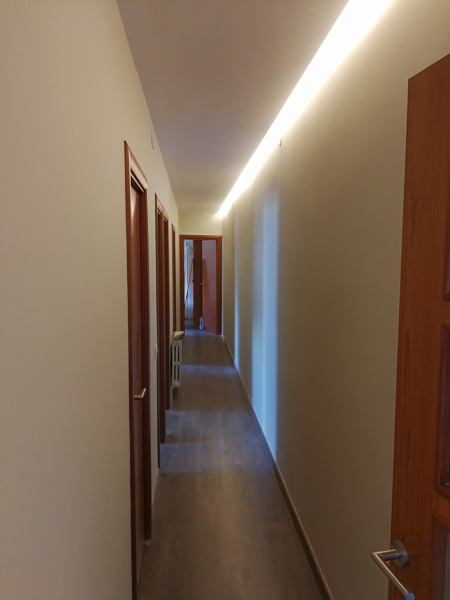 Quedaría acabado en una semana y media, entre dos personas. Rascar gotelé y alisar, preparar paredes y techos y acabado a dos capas de plàstico blanco.