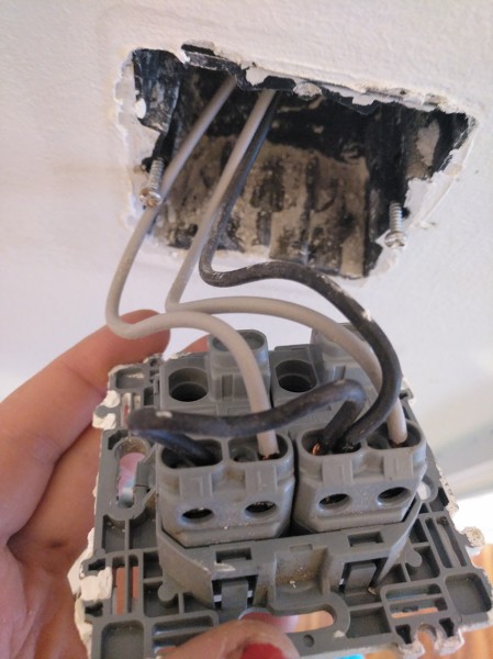Para la luz del baño tienes que hacer lo mismo junta el cable negro con el gris y ya esta. No hace falta ni que le pongas un borne puedes juntarlos en el terminal del mismo interruptor, caben 2 cables