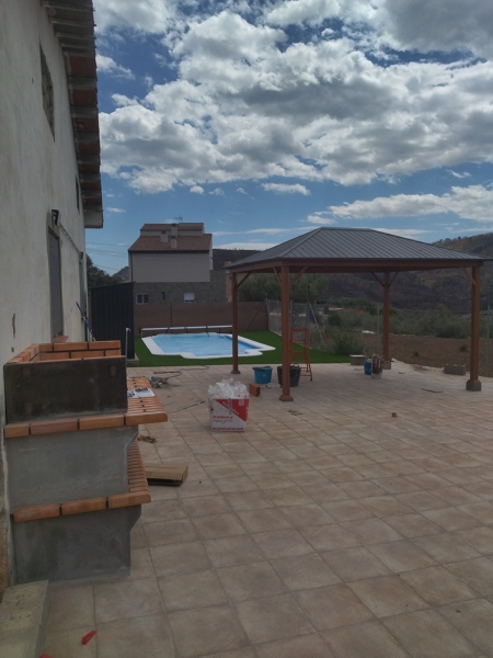 Quiero tirar el cuarto de trastos el tejado y el paellero. Echar 10m² hormigon donde está el árbol para luego poner encima del suelo pavimiento 50m². Hacer en 3metros un paellero y una bancada para colocar un fregadero.