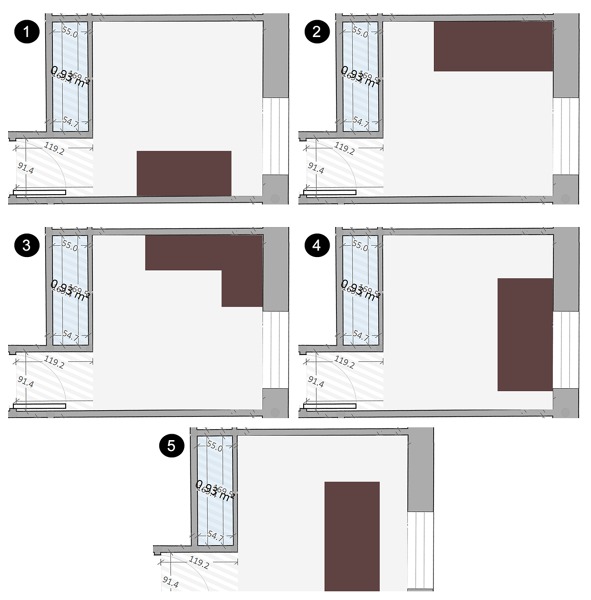 Por regla general, se recomienda para personas diestras que la luz natural nos incida desde la izquierda, para no crearnos sombras con la propia mano al escribir. Es un concepto omuy aplicado para estudiantes que tengan que realizar trabajos escritos a mano o que tengan que leer mucha documentación. Para esa utilidad la mejor opción sería la 1, pero como habrás podido hacerte idea, el radiador y el acceso al dormitorio condicionan bastante el tamaño de la puerta.
