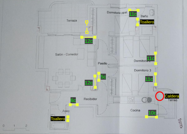 quisiera saber posibilidades y soluciones para climatizar una terraza, que tras instalar un cerramiento con triple acristalamiento, se va a convertir en un despacho. Para ello la idea inicial sería instalar un radiador contiuando el ramal del salón (adjunto plano de casa con situación de cada radiador y con num de elementos). El problema podría venir qu ela sección de la tubería de los radiadores es de 16mm multicapa y tal vez no sea suficiente. Tampoco se plantea instalar un aparato de aire/bomba de calor.