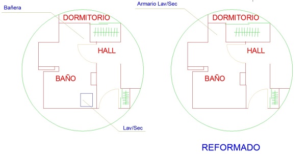 Al tener un piso relativamente pequeño he pensado incorporar la lavadora (y posiblemente secadora) en el baño así como algún mueble auxiliar para la gestión de la ropa.