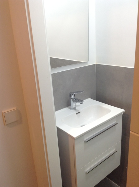 Le envío fotografías de un aseo aún más pequeño con puerta corredera zócalo de placas y suelo porcelanico iguales en tono ceniza claro y paredes en blanco.