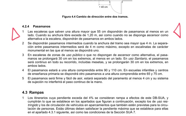 Si te interesa el tema, te recomiendo que te leas el Documento Básico SUA: Seguridad de utilización y accesibilidad. Pero te recomiendo leerlo entero, desde su introducción hasta sus anejos finales, para entenderlo bien, porque si solo nos dejamos llevar por una única captura de pantalla con algunos apartado de una página concreta de esta norma o de cualquier otra, como se ha hecho en este hilo, lo más seguro es caer en el error de interpretación.