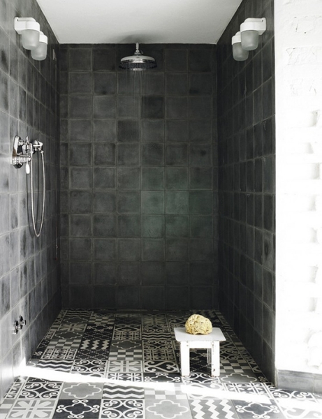 efectivamente son imitación a baldosa hidráulica y a mi parecer son deslizantes y creo que no es el suelo adecuado para una ducha,yo en particular recomiendo unas mayas que hay de 30 x 30 cm de piedra de pizarra en imitación a gresite ya que hay varios tonos y modelos y dan un excelente resultado quedando una base antideslizante y mas segura, creo que debería de asegurarse y no por catalogo sino con una muestra real porque aunque la foto es buena no podemos ver en realidad su calidad y si es el material que en realidad queremos para nuestro trabajo un saludo.