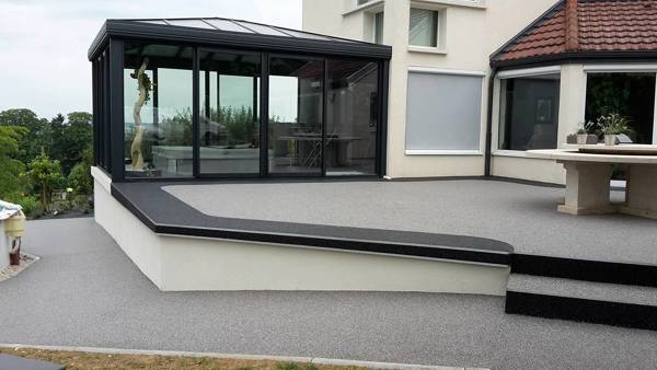 El pavimento utilizado alrededor de la piscina de la foto es un pavimento drenante, llamado Hydro’Way®.
