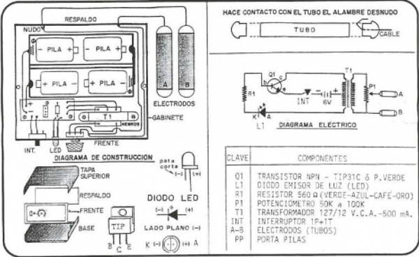 La caja de toques es un circuito muy sencillo un transistor TIP41 un transformador un switch , un potenciómetro de 50 k un led y su resistencia , el transistor impulsa una oscilación al generarse un corte por saturación que al estar acoplado al transformador induce una tensión pulsante que amplifica por inducción hacia la carga , el voltaje recupera su oscilación completa pasando de corriente directa a alterna elevándose de o a 100 volts consumiendo de 6 a 10 mA,el sistema es alimentado por una tensión nominal de 6 volts dc con un consumo de 500ma,