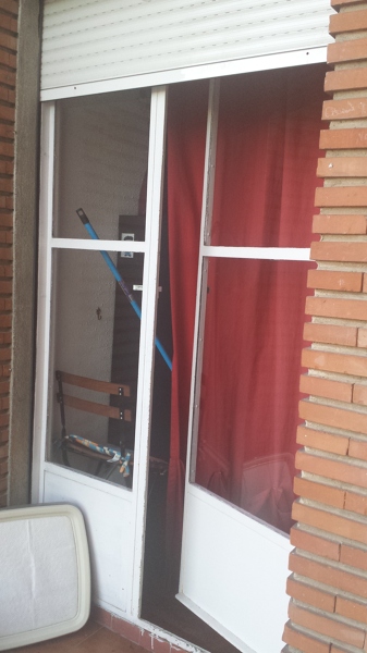 - 1 puerta de terraza 2014 alto x 116,5 ancho con 1 hoja fija de 51,5 ancho y cristal de alto x 48 ancho y otra móvil de 68,5 ancho y cristal de alto x 64 ancho. Con caja antigua de persiana de 25 alto x 27,5 profundidad.