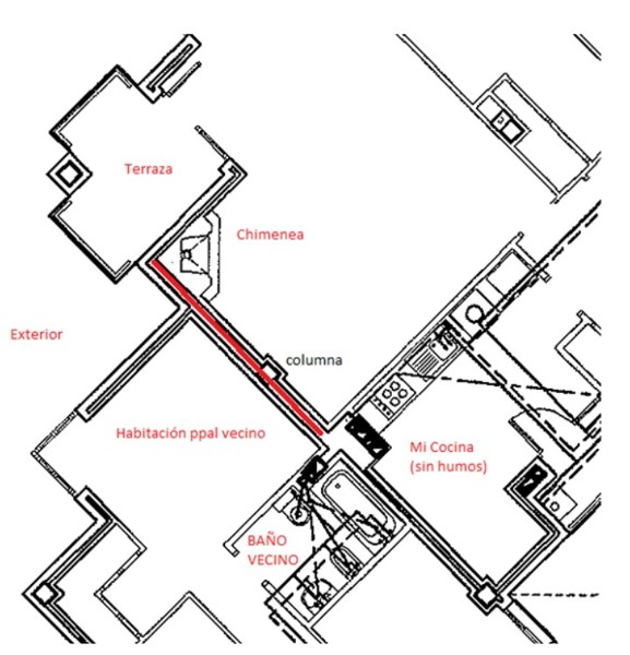Si una vertical de ventilación es de baños, generalmente se tiende a agrupar todos los baños o lo máximos que sean posibles, alrededor de dicho núcleo de ventilaciones y bajantes, que tenga usted una vertical para chimenea cerca, cuanto menos, me choca... o viceversa, si su vertical es para chimeneas, a lo mejor es el baño del vecino el que no está donde debiera.