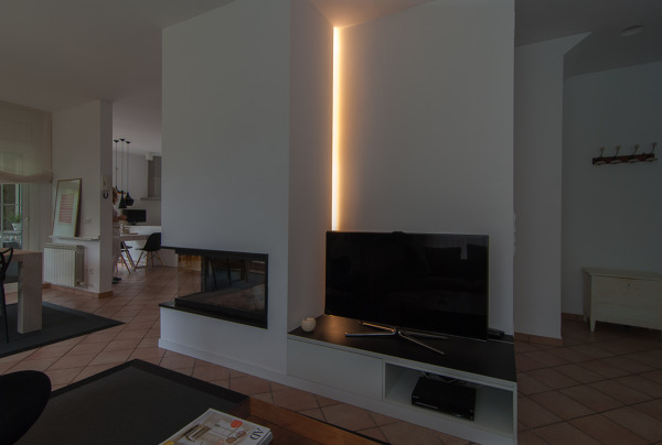 ¿Cómo se ha conseguido esa iluminación entre televisión y chimenea?