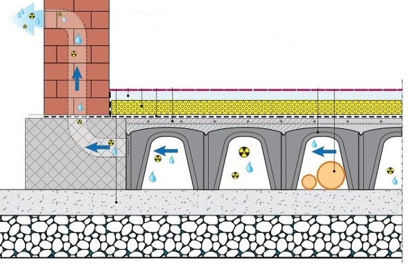 En definitiva, tal como ve en la imagen que le adjunto de la web caviti, se trata de crear una cámara de aire inferior que impida el contacto directo del terreno y esta cámara deberá estar muy ventilada con el exterior, bien con conductos como se indica en el dibujo, bien, si es posible mucho mejor, con entradas y salidas en horizontal sin tanto quiebro y conviene no quedarse corto con dichas ventilaciones, que deberán ser en todas las fachadas que sea posible.