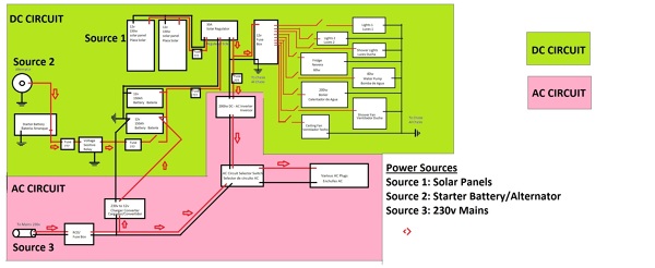 llevo semanas buscando la respuesta a esto! Me podrias decir los grosores de los cables que me hacen falta para cada parte de este circuito, y los fusibles de cuantos amperios para cada parte. Aqui te dejo el esquema del circuito