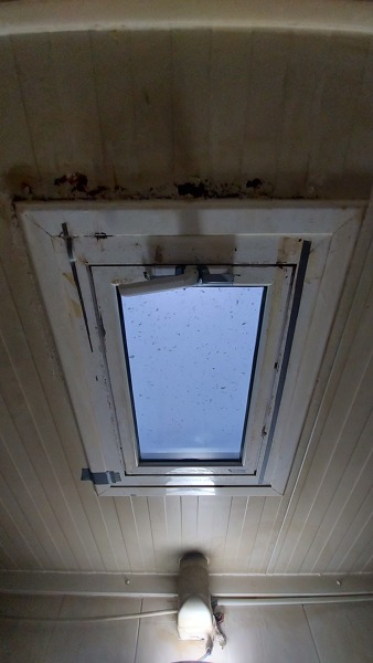Efectivamente, eso es una chapuza... tiene una ventana colocada en horizontal, pensada para estar colocada en vertical... no tiene solución alguna que no sea cambiarlo por un sistema adecuado y una claraboya puede ser, puesto que se fabrican para cubiertas, eso sí... si puede, que sea un poquito más grande de 40x60 cm que después no hay quien salga por huecos tan estrechos.