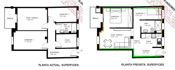 Le adjunto un extracto de planos del proyecto de remodelación de una vivienda de un cliente dónde la cocina pasó a estar abierta con poquitos cambios, pero los suficientes para darle otra vida a una vivienda de reducidas dimensiones.