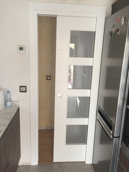 Hola, una vez nivelado y aplomado el armazón metalico bastaría con poner un listón de madera atornillado al suelo en la parte encastrada para subir el armazon o casoneto a la altura del suelo nuevo, necesario para que la guía inferior de la puerta quede sólida al fijarla a los laterales del casoneto. Adjunto foto puerta corredera de 4 vidrios para la cocina, con casoneto de ancho interior 56 mm. Un saludo