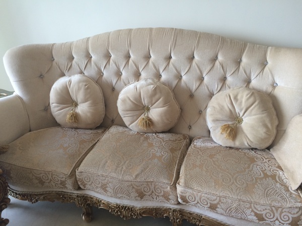 Yo me plantearía la opción de tapizar en una tela más acogedora, manteniendo el dorado de las molduras, el negro le daría un aire sofisticado, aunque tal vez mucho protagonismo en la sala (si el suelo es tan claro como el de la foto), así que si prefieres un salón más luminoso y elegante optaría por un blanco o crudo. Me olvidaría de esos cojines, consulta con tu tapicero y combina con colores que contrasten con la tela del sofá, tanto en color como en textura (cuidado con las medidas: la proporción con el tamaño del sofá es clave)