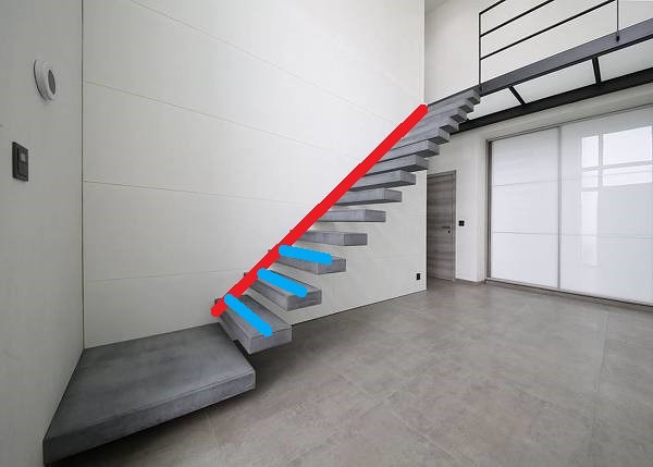 Esto ya se ha explicado muchísimas veces en estos foros, pero bueno... de manera sencilla y usando la misma fotografía que ha subido usted; lo que se hace es embutir en el muro lateral un perfil metálico a modo de viga o zanca inclinada de porte y dimensiones suficientes para resistir los esfuerzos de la escalera (lo que sería la línea roja que he dibujado) y desde ese perfil, salen en perpendicular a modo de ménsula, otros soportes sobre los que apoyan los peldaños, bien situados por debajo de los mismos o bien introduciéndose en el interior de los peldaños (líneas azules).