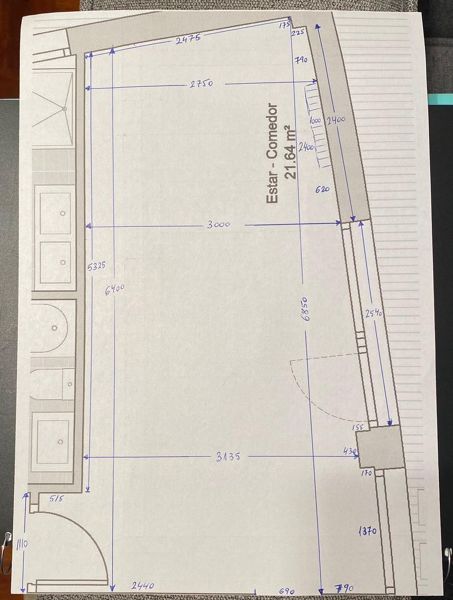 Nos han entregado un piso nuevo y nos estamos volviendo locos para decorar el salón comedor. La toma de tv está en la pared del fondo y en la pared de la derecha (la de las ventanas) había un radiador grande, con lo cual en principio la única opción posible era poner el sofá en el medio del salón frente a la pared del fond; el problema es que esa opción no nos convencía nada y al final hemos eliminado ese radiador (lo hemos colocado en otra pared donde había uno pequeño) y ahora la duda es si poner el sofá en la pared de la derecha o la de la izquierda y como organizar el resto. El sofá ya lo tenemos, mide unos 2,05 y tiene una profundidad de mas o menos un metro (es un dos plazas articulable);queda un espacio estrecho entre el sofá y la pared de enfrente y además las paredes no son paralelas. Necesitamos poner una mesa de comedor para dos personas en la zona opuesta al sofá (ahí hay una puerta corredera que da a la cocina).