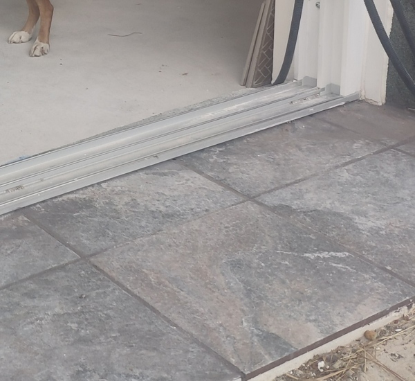 Ese modelo de puerta de Deceuninck, se debe fabricar con cerco perimetral, mismo perfil inferior que el resto del cerco, lo que puede suponer un pequeño tropiezo, pero te evitaría el problemón que se te presenta ahora con el cerco inferior plano que es el que te han instalado.