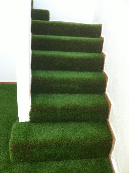 La colocación de césped en una escalera no es lo más usual,pero si quiera colocarla ,la tiene que pegar con cola de impacto,que encontrará en cualquier drogueria o ferreteria.