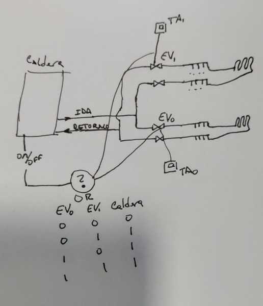Tengo pensado poner una electroválvula por planta con su correspondiente termostato y colectores en cada planta. Pero me falta una pieza en el sistema: cómo combino las señales de las electroválvulas/termostatos para encender/apagar la caldera en función de si al menos una de las dos plantas requiere calor o las dos zonas están apagadas?
