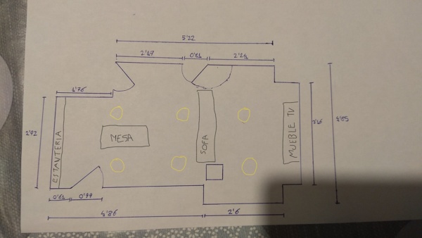 Este es un plano del salón. En amarillo he puesto más o menos donde irían los focos