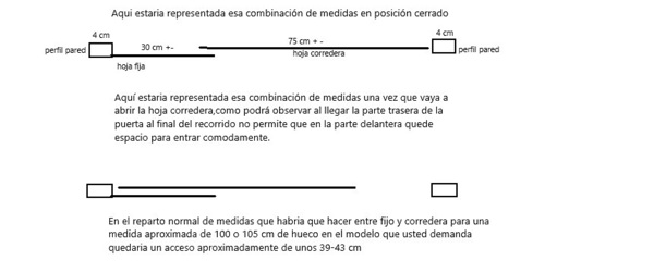 Hola Ana,lo que usted demanda no es factible y en el dibujo que le mostramos en la primera fotografía lo podrá entender. En principio para calcular el espacio de acceso que quedaría con ese sistema necesitaríamos saber la medida de hueco real que usted tiene entre las dos paredes. Los repartos de medidas se hacen siempre por sistema aproximadamente unos 10 cm mayor la hoja corredera que la hoja fija para que las asas queden justo delante del fijo al correr la puerta y dichas medidas de acceso son mayores cuanto mayor es el ancho de la mampara, pero en huecos pequeños es imposible que quede un acceso amplio, algo mayor quedaría si es de tres hojas de corredera y las que mayor acceso dejan son las de puertas abatibles. Una mampara como la que pregunta usted en esa fotografía con aluminio en brillo y serigrafía central tiene un costo de 400 € IVA incluido y envío gratuito. La de tres hojas de corredera también con aluminio brillo y serigrafía central 620 € IVA incluido y envío gratuito. La de una hoja fija de 35 cm y una puerta abatible de aproximadamente 75 cm con aluminio entre ambos con serigrafía central 475 € IVA incluido y envío gratuito y la de la misma composición de fijo y puerta abatible pero con bisagras 685 € IVA incluido y envío gratuito. El costo de la instalación varia en función de la provincia en donde usted viva ,ya que cada zona y cada instalador tiene sus propias tarifas que no son iguales en todos los sitios, para saber el precio exacto necesitaríamos saber donde habría que instalarla. Esperamos haberle ayudado y si necesita cualquier aclaración estaremos encantados de volver a contestarle. Un saludo.