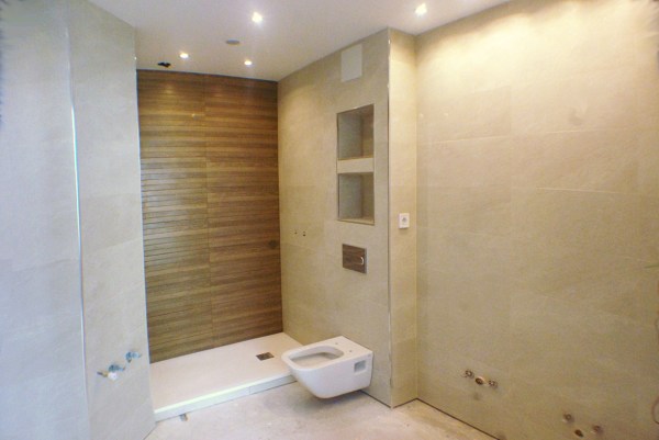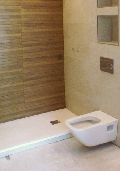 Las canalizaciones quedan ocultas tras un "tabique" falso, al cual se le puede incorporar una "hornacina" o zona de baldas.
