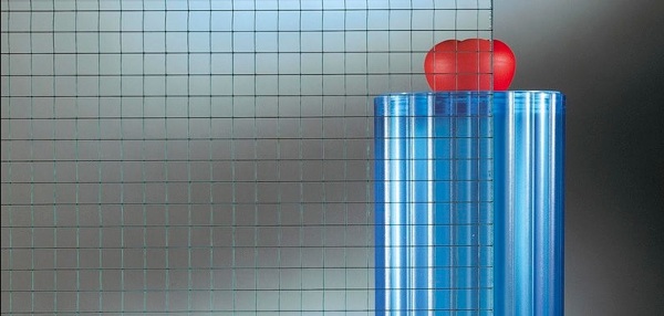 En la web de ACG GLASS EUROPE tiene varios tipos de paneles de vidrio con enrejado de malla como la fotografía que adjunto sacada de dicha web.