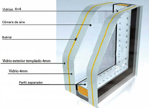 Un laminado son dos vidrios unidos mediante un butilo, (una lámina transparente). La función es que si se rompe el vidrio, evita el peligro de que se caigan los trozos como si fueran cuchillas. Una designación 44.1 corresponde con 2 lunas de 4mm unidas con un butilo de 1mm.