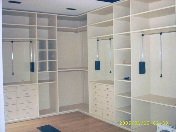 Hay que tener en cuenta que no es lo mismo un vestidor abierto, como el de la fotografía, que uno cerrado, pues si es cerrado, hay que amoldarse a las dimensiones de puertas estándar del mercado o fabricarlas a medida, lo cual, como se puede imaginar, encarece el trabajo; sin embargo, en un vestidor abierto, se pueden modular los espacios centrales en función de cajones, accesorios, etc, estándar y jugar con los cierres (por ejemplo, en la fotografía, con el rincón que ocupa el centro de la foto, que se puede ajustar y cortar según el espacio disponible).