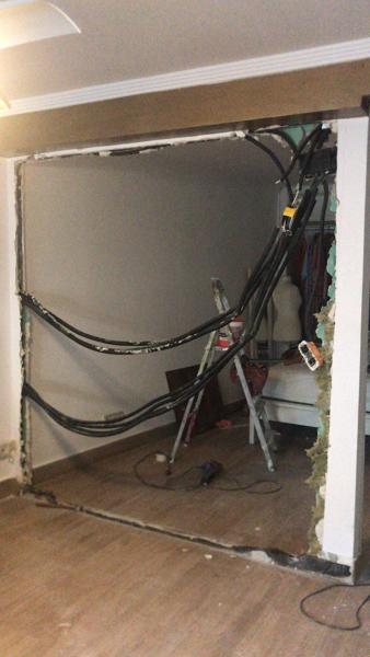 Se ve en la foto que han quitado un tabique interior que contenía canalizaciones de electricidad, y que deben ser reconducidos por otros tabiques, por falso techo si hubiera, o construyendo un encajonado para tal efecto.