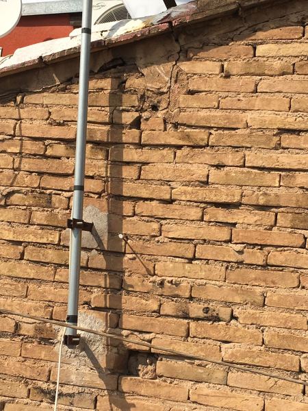 lo ideal seria lucir con mortero y pintar con una pintura para exteriores, eso te quitaria las filtraciones de lluvia, ademas de no meterte en la propiedad el vecino.