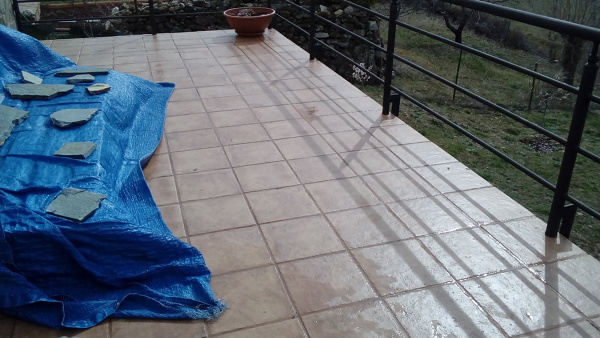 Terraza descubierta en la sierra de 24 metros cuadrados produce humedades en el salón y en una habitación `por capilaridad según el perito, el suelo es de gres para exterior pero el mortero o no se ha aplicado bien o es de mala calidad, las juntas se levantan y las baldosas se mueven, la inclinación del suelo no es mucha pues en la parte más ancha la capa de mortero es de 10 cms. y en la más delgada de 6 cms, en una anchura de 3 metros. ¿Qué solución se podría aportar?¿Sería buena idea quitar todas esas baldosas, mortero incluido y poner hormigón impreso?