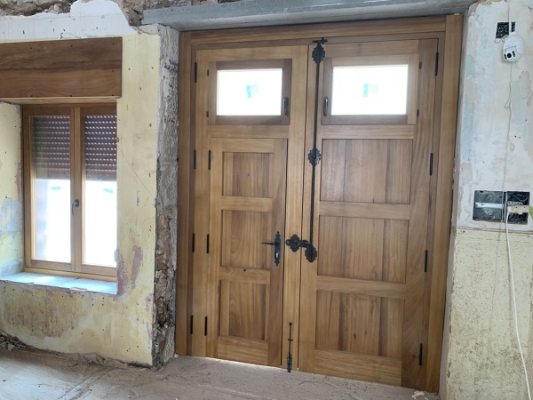 Hola Irene, les envío imágenes de puertas exteriores de madera iroko fabricadas e instaladas por nosotros, barnizadas al agua con producto apto para exteriores. El ppto. de su puerta de acceso, fácil de realizar, es de 1950 €. Hablamos Gracias.