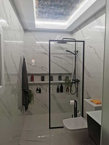 El cuarto baño hace 1,35 x 1,80. Sería desmontar todo lo que hay ahora, desalicatar, volver a alicatar, poner nuevo mueble-pica-espejo, nuevo inodoro y plato ducha-mampara. También poner falso techo de pladur con 2 luces. Todos los materiales los pondría yo, o sea que sólo sería el precio para trabajos de albañilería y lampistería. Zona Hospitalet.
