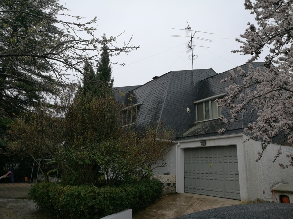 Fachada de una vivienda de 3 alturas , con techo de pizarra.