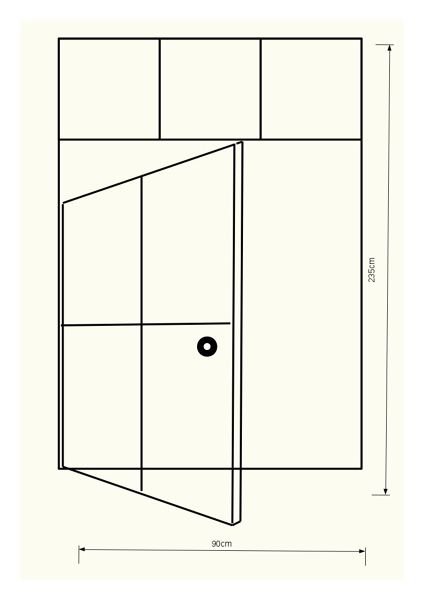 Sería una estructura de 235 cm de altura total y 92 cm de anchura. Una única hoja. El metal, lacado al horno en color negro, el vidrio de 4 mm. transparente