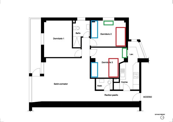 Por ejemplo, la cama del dormitorio 3 se podría llevar hacia el centro de la habitación y con un armario de puertas correderas, permitir paso a la cama por ambos lados; la cama del dormitorio 2 se podrían girar 90 y dejarla alineada con la entrada, bien pegada a la pared con el dormitorio 2 o si hay espacio, algo más centrada permitiendo acceso por ambos lados... y así, multitud de opciones que, in situ se pueden plantear mejor o, disponiendo de planos acotados y fotografías.