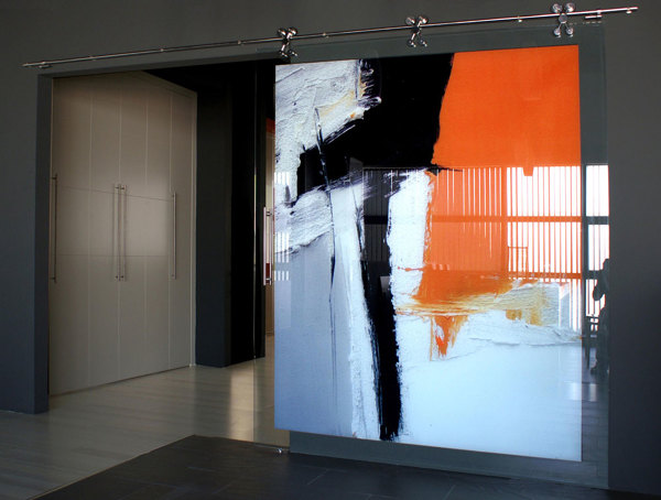 Lo que ves en la imagen es una puerta corredera de una hoja de vidrio doble templada deslizante con vinilo entre vidrios parece un cuadro pero en realidad es una imagen que se pega posteriormente nosotros hemos realizado trabajos por el estilo y el resultado es muy impactante así como muy estético si quieres mas información póngase en contacto con nosotros muchas gracias