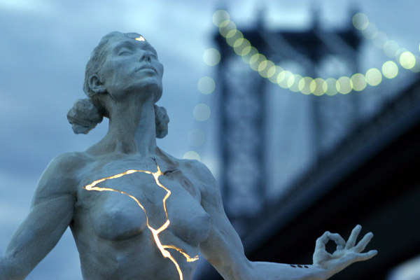 La foto fue tomada en The Fulton-Ferry State Park en el Parque del Puente de Brooklyn (Brooklyn), pero me parece que la estatua está ahora en una colección privada. No obstante, sé que se estuvieron recogiendo firmas para devolverla al mismo parque donde se tomaron las fotos. Quizás ya la hayan devuelto. ¡Suerte!