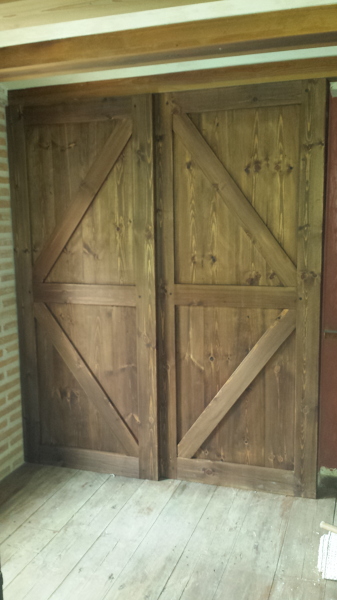 La estructura de las puertas que está viendo sin de dm. Son imitación a las de los graneros antiguas como dice un compañero. Tampoco son tan caras. Al fin y al cabo son estructuras de dm lacadas en un color x. Lo interesante son el sistema de carriles que les quieras poner. Se pueden hacer macizas o semi- huevas. Sobre todo por el peso y las paredes que las van a soportar. Si estuviese interesada se las podíamos presupuestar.