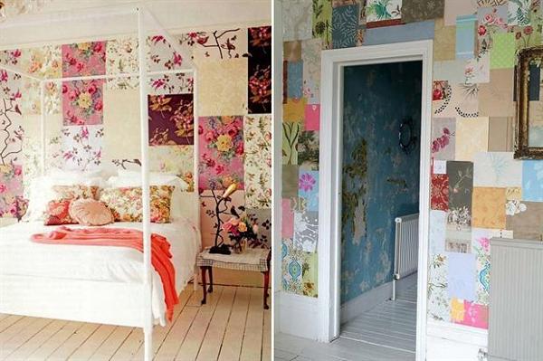 Lo que se me ocurre es; no se si tu has oído o conozcas el termino "Patchwork", este término se refiere a recortes de telas, se recorta en forma de cuadrados normalmente, y se unen unos con otros, de esta manera se forma un lienzo del tamaño que tu quieras, que en tu caso, te servirá después como papel pintado.