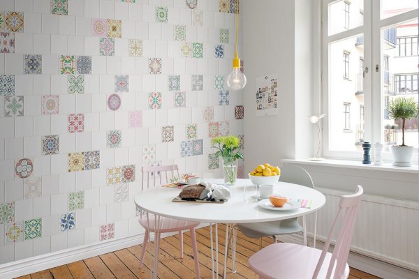 Creo que una solución para ti, practica, económica y sencilla seria; en primer lugar, dar un fondo con pintura a la pared, en color o en blanco como la que muestras, y después elegir telas que te gusten y hacer los recortes de cuadros, para pegarlos a la pared, formando una especie de collage, es decir, pegándolos de forma indistinta en la pared. Creo que podría ser una buena alternativa.. Los cuadrados desde luego los puedes hacer también con papel.