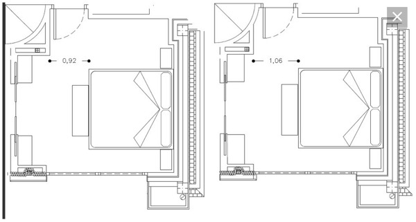 Tenemos dos opciones de entrada a la habitación principal, una es con la pared recta y otra con una pared curva al principio y luego recta. La idea es poner un banco delante de la cama, tal cual se aprecia en el plano. Nuestra duda es si merece la pena o no perder la linealidad de la pared en la entrada a cambio de ganar 14 cm en el paso entre la cama y dicha pared, pasando de 92 a 106 cm, teniendo en cuenta que el banco que comentamos está en la trayectoria de entrada. Os adjunto plano.