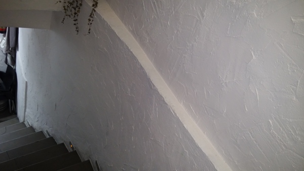 Se hace con pintura al agua a la que se le añade unos puñados de escayola y se eparce con una espatula y rodillo.