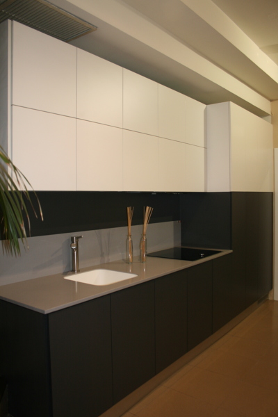 Las encimeras en negro van con todos los colores , hay una encimera de ROCALIT en blanco que tiene el mismo color que los laminados blancos brillo y es más barata que DEKTON con unas propiedades inigualables , no absorbe liquidos, no se quema .
